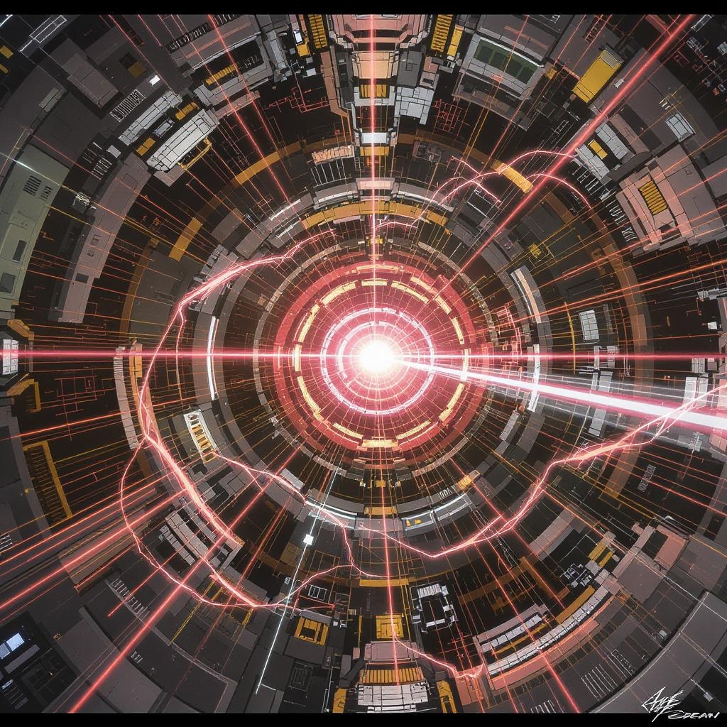 Futuristic interior of a spaceship inspired by Tsutomu Nihei's style and Sidonia no Kishi, featuring grandiose scale and gigantism with a central laser generator. The environment includes multi-story spaces with hyper-detailed, sci-fi elements. A powerful laser beams from the core, creating energy clots and accelerating light flashes, embodying a sense of speed and motion. The style is reminiscent of anime and manga graphics, presented in ultra-high-definition 8K resolution for super-resolution detail. Vertical composition with a dynamic interplay of light, evoking a sense of technological wonder and futuristic ambiance.