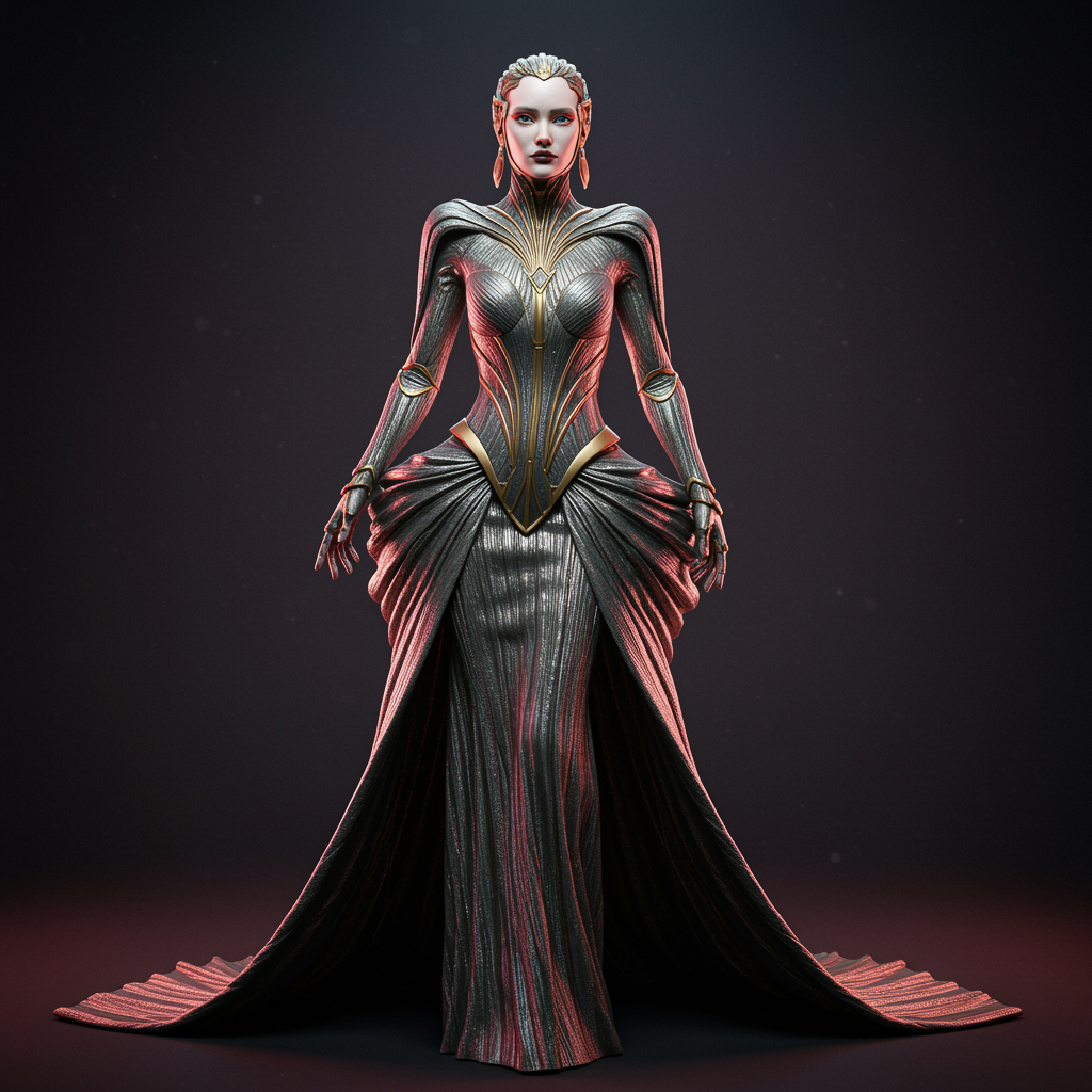 View this AI-generated image featuring futuristic metallic couture gown inspired by iris van harper full body concept art with a retro touch octane render ultra high definition 8k resolution hyperrealistic style 3d render studio lit fashion photography with a touch of ethereal glow intricate detaili