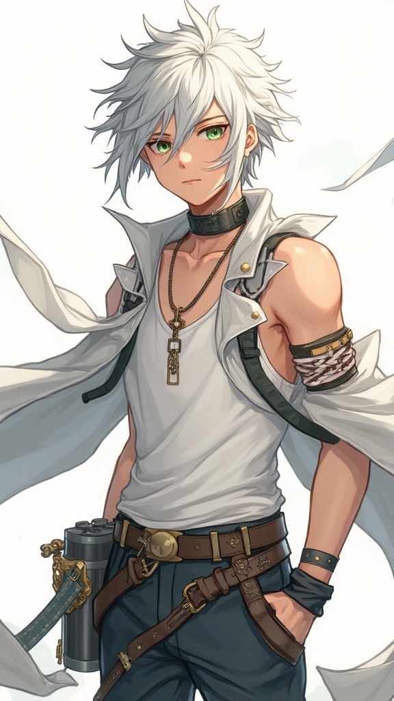 View this AI-generated image featuring a 2d game art depiction of a young man with silver white hair 16 years old vibrant green eyes wearing a white tank top layered with steampunk inspired attire his ensemble blends classic steampunk elements with modern anime aesthetics emphasizing intricate detai
