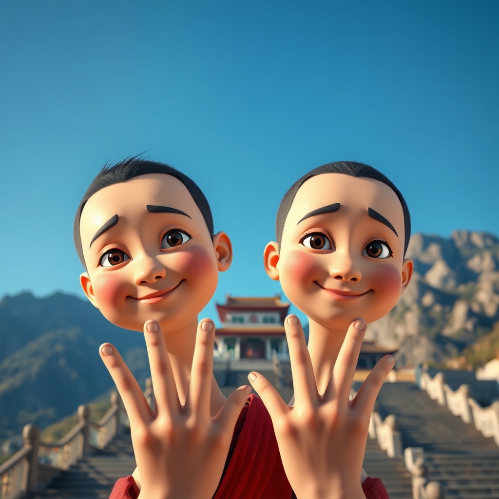 Ganyudef, upper body, friendly expression, rosy cheeks, outdoor setting, daytime, minimalist background, clear blue sky, short hairstyle, open sky, temple backdrop, direct gaze, ascending stairs, mountainous region, atmospheric lighting, 8k resolution, ultra HD, high dynamic range, symmetrical features, unique twist, diverse elements, faces in unison, playful gaze, elongated neck, multiple fingers, altered hand shapes, unrefined resolution, partially visible, slight blurriness, compression artifacts, absence of text, framed composition, animated style, split perspective.