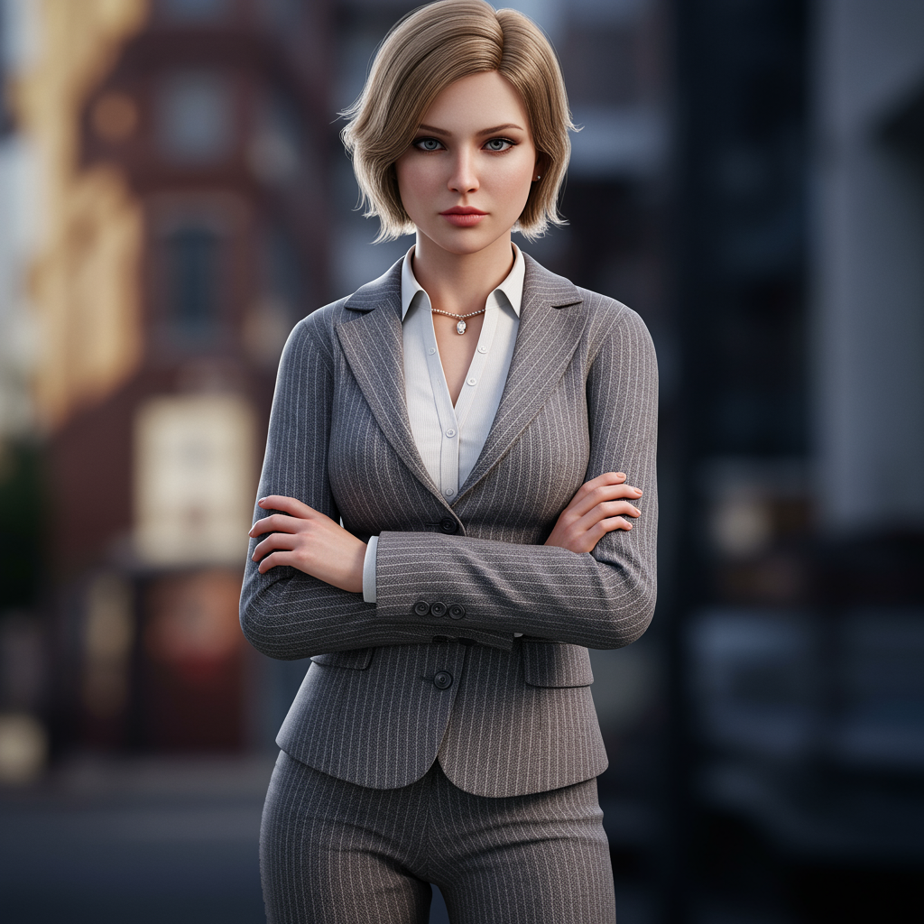 As the viewer gazes upon the image, they are immediately drawn to the mesmerizing presence of the ultimate female business leader. She is elegantly dressed in a tailored suit that highlights her poise and command. The fabric, a luxurious mix of wool and silk, features a delicate pinstripe pattern that enhances the ensemble's sophistication. The suit jacket is expertly fitted with a sleek lapel and three buttons that define her slender waist. This visual is depicted with CGI, capturing a doll-like perfection in a 3D render. Despite being low resolution, the image maintains a certain charm, even with text errors or potential flaws like jpeg artifacts or blurring, as it encapsulates the striking beauty and authority of this businesswoman.