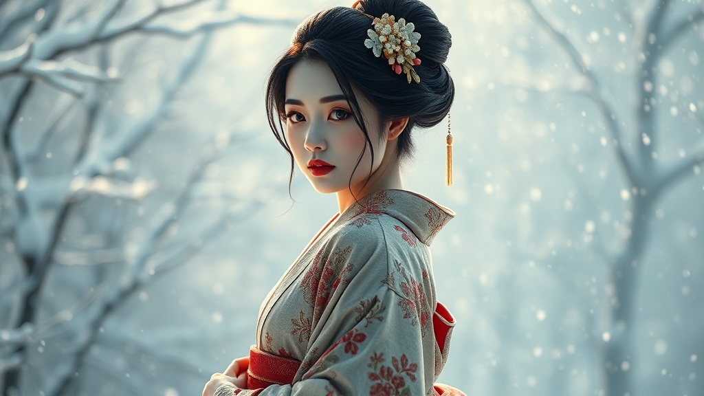 View this AI-generated image featuring a stunning geisha stands gracefully amidst a snow covered landscape her milky white skin contrasting against the delicate snowflakes she wears an intricately detailed kimono exuding elegance and poise reminiscent of artworks by tom bagshaw and seb mckinnon capt