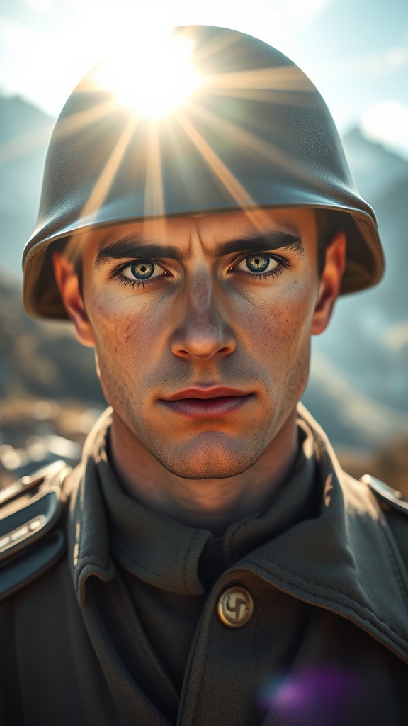 German soldier during World War 2 standing with strikingly lifelike eyes and detailed pupils, male figure depicted in a style reminiscent of Joaquín Sorolla’s intricate artwork. Bathed in soft natural light, the scene captures sunshine gently illuminating his face, with cinematic lighting enhancing the atmosphere. The 85mm lens effect provides a sense of depth, while lumen reflections add realistic highlights. Set against a breathtaking environment, this hyperrealistic portrayal blends the art of photography with advanced CGI elements, utilizing octane render and raytracing to achieve stunning visual fidelity.
