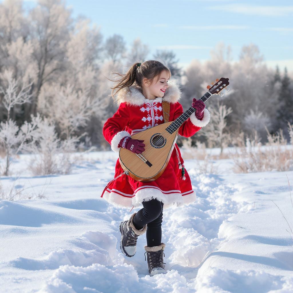 A young girl dances joyfully across a snowy meadow, her laughter mingling with the crisp air as she sings vibrant melodies. Her fingers deftly pluck the strings of a bandura, weaving enchanting tunes that echo through the winter landscape.