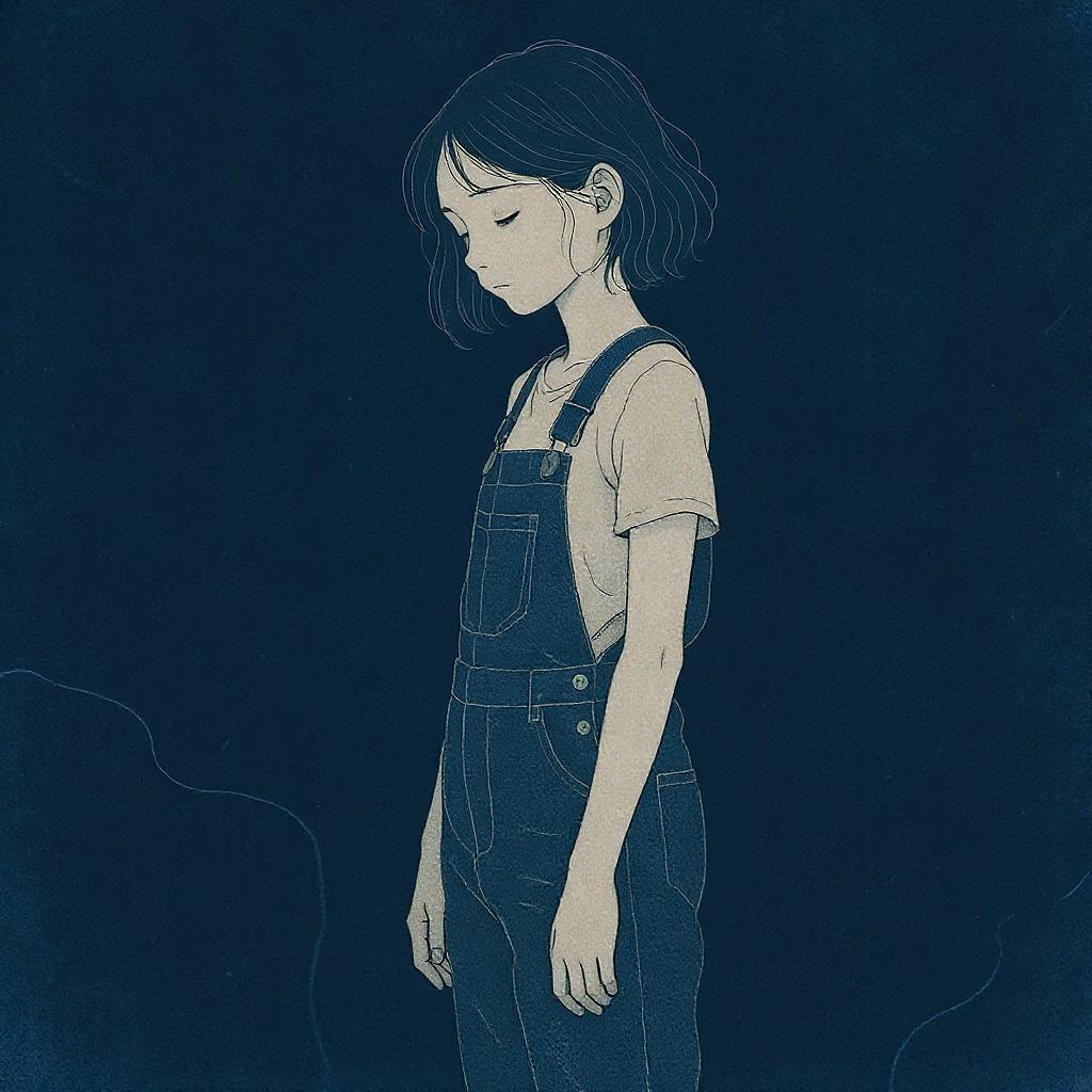 View this AI-generated image featuring a young girl in faded denim overalls stands nonchalantly her posture relaxed and slightly slumped the scene evokes the minimalist beauty of gongbi art with wavy lines softly defining her silhouette against a backdrop of deep dark azure hues her hair slightly fr