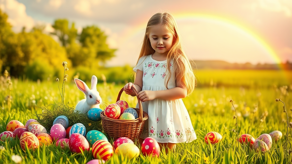 A young girl with long golden hair stands in a lush meadow, surrounded by an array of brightly colored Easter eggs of varying sizes and intricate designs. The sun bathes the landscape in warm, golden light. The girl, dressed in a white frock adorned with delicate floral patterns, gently holds a woven basket overflowing with vibrantly hued eggs. Nearby, a playful white bunny peeks shyly from behind a bush, its twitching nose full of eager curiosity. In the distance, a magnificent rainbow arcs across the sky, adding a touch of enchantment to the idyllic scene.