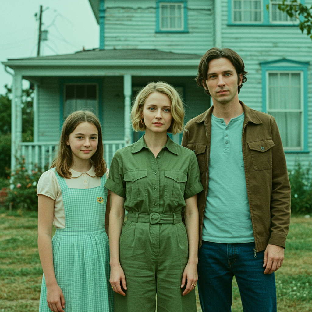 View this AI-generated image featuring a young girl an elegant lady and a laid back man stand together in front of a quaint vintage house the scene is washed in dreamy hues of light turquoise and gentle yellow evoking a nostalgic post 70s ego generation aesthetic their expressions capture a blend of
