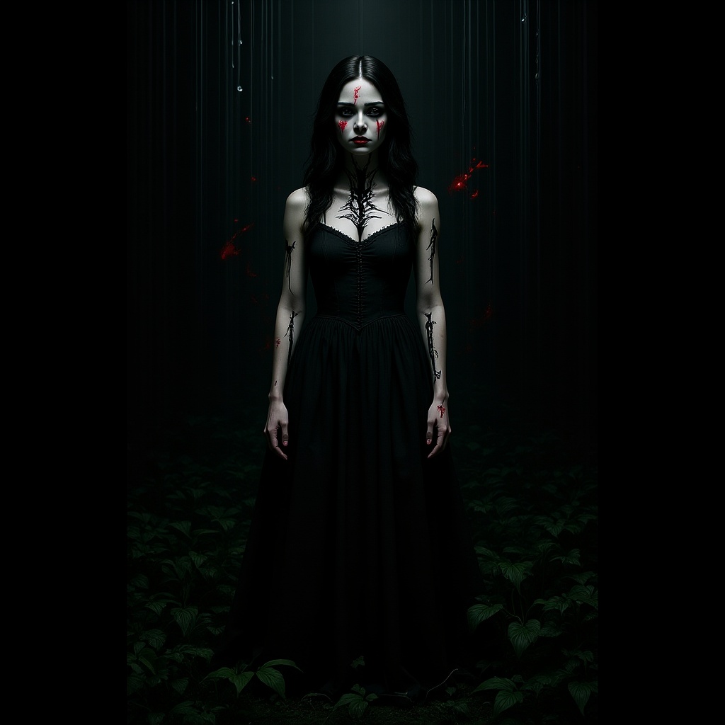 View this AI-generated image featuring a mysterious girl stands in a high cut dress her skin marred by black veins oozing oil predatory plants twist around her feet mingling with ivy while her face emerges from the shadows somber and ghostly with hints of red splashes and smudges accentuating her fe