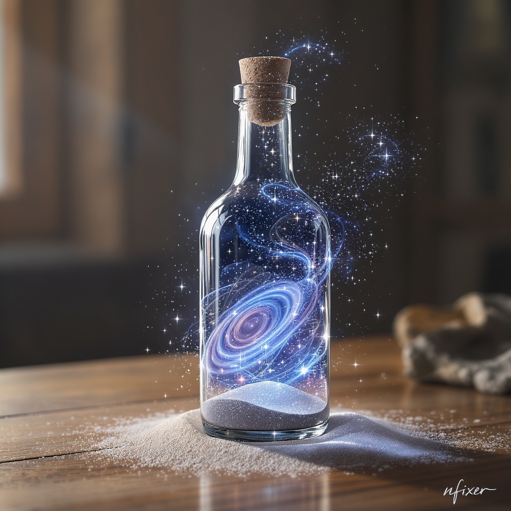 Glass bottle atop a table, photorealistic painting, pexels inspiration, conceptual art blending stars and galaxies, exquisitely detailed perfect render, ethereal light effects, modern fantasy theme, shimmering cosmic adornments, universe within a grain of sand, masterful photo manipulation, stunning composition in nfixer style, nartfixer essence.