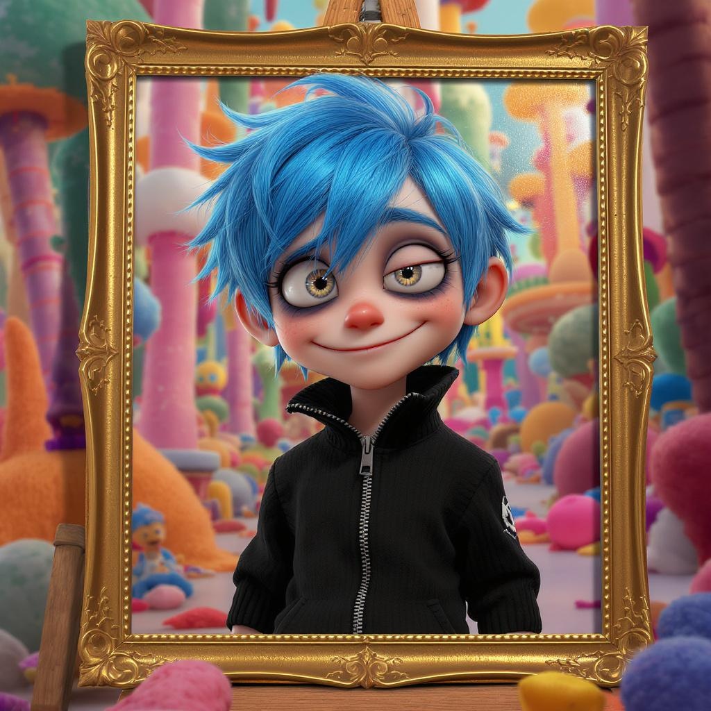 Glazed 3D render of a boy with blue hair wearing a black zipper top, influenced by Pixar and Disney styles, showcasing an 8k resolution with a beautiful canvas frame. The image captures a cartoonish 3D environment featuring vibrant and unusual colors. The boy appears with exaggerated proportions, including extra fingers and limbs, resulting in a surreal and whimsical appearance. A touch of humor is added with his cross-eyed expression and a playfully distorted face. Though some elements might appear blurry or oddly proportioned, it enhances the charm of this imaginative and quirky render.