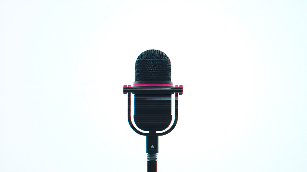 View this AI-generated image featuring glitch art featuring linear distortion and digital interference vertical portrait of a solitary microphone silhouette minimalist white backdrop with horizontal distortion and scan line interference pattern gentle diffused lighting corrupted data aesthetic with