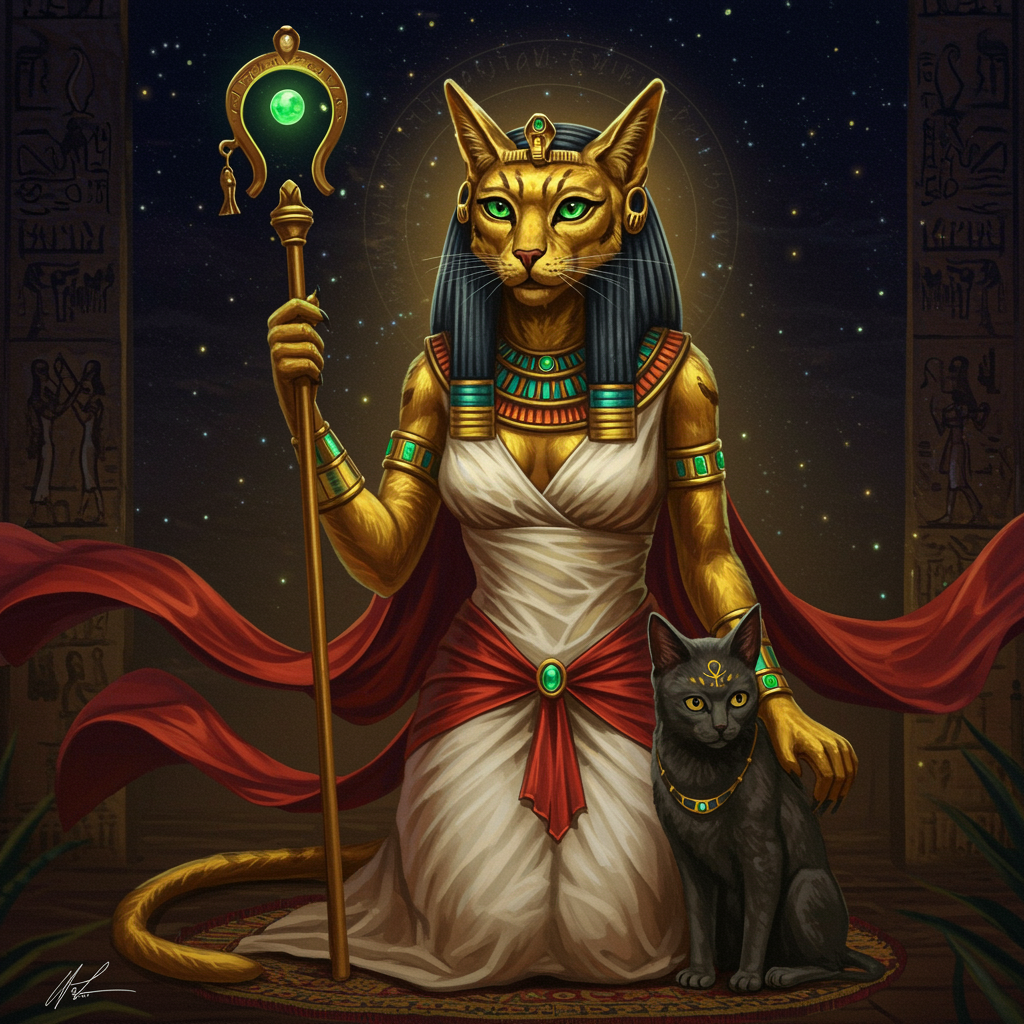A mystical goddess inspired by Bastet, revered as the guardian of home and family, depicted as a feline with shimmering golden fur, her eyes gleaming like emeralds. She wields a staff adorned with ancient hieroglyphs, symbolizing protection and grace. Her presence radiates warmth and serenity, embodying the balance between ferocity and gentleness. Her ancient drapery flows like silken whispers, echoing the timeless sands of the Nile. The goddess presides over twilight gatherings, where moonlit melodies honor her divine spirit, and her feline companions bask in her nurturing aura, reflecting her eternal connection to the mystical and the mundane.