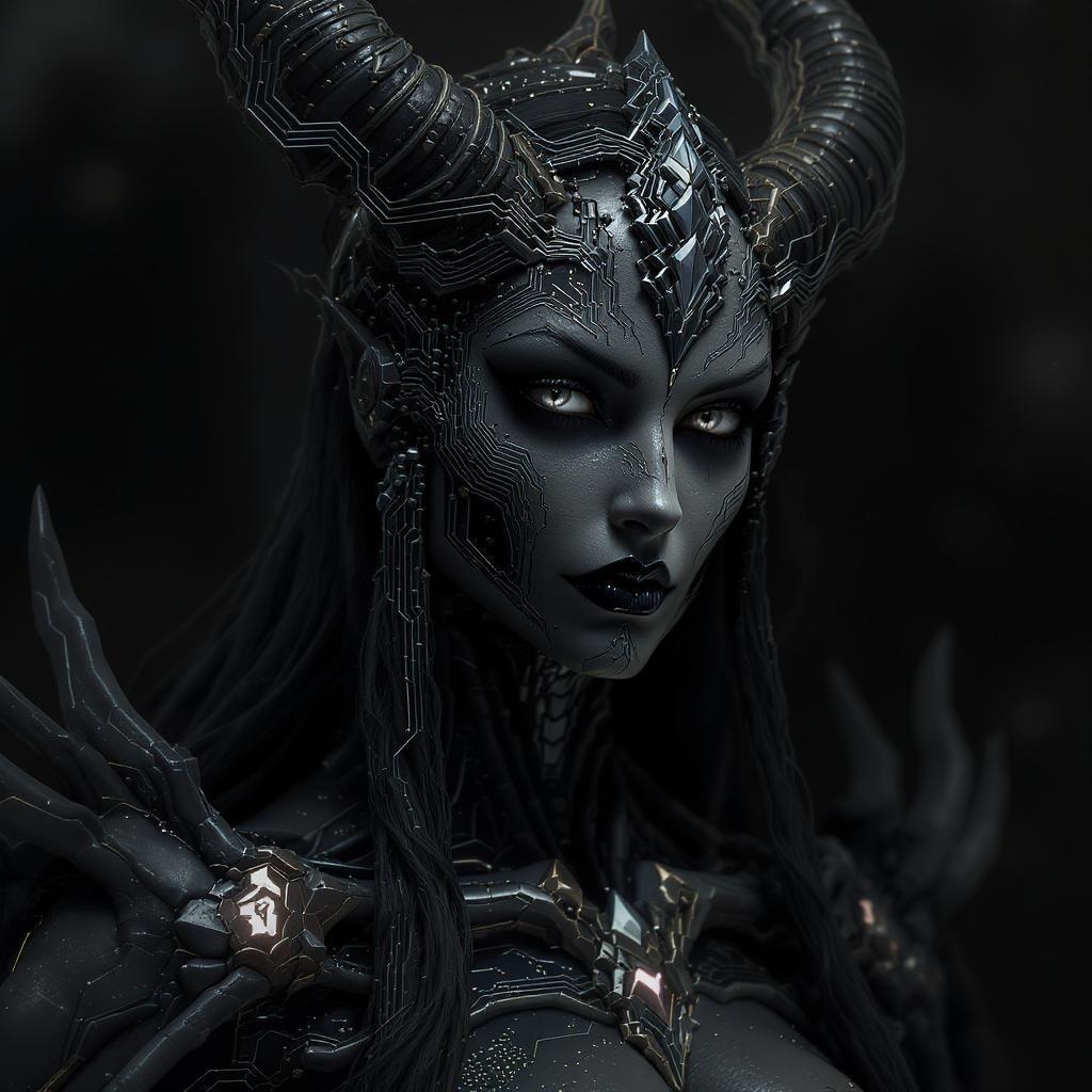 Goddess of Death, intricate detailing, exquisite facial features, ultra quality, cinematic lighting, flawless and captivating visage, impeccable composition, realistic elements intertwined with circuit board motifs, fantasy infused, artstation worthy, evocative dark fantasy with a photorealistic touch, intense shadows and lighting interplay :: 8k resolution, superbly detailed 3D octane render, sharp focus, suitable for wallpaper, HDR richness, high-definition sharpness, stylized to perfection with slight creative nuances, maintaining a perfect balance of beauty and mystique.