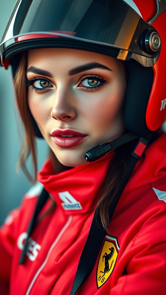 View this AI-generated image featuring gorgeous female dressed as a formula 1 driver embodying the iconic ferrari spirit exuding attraction and charm engaging the viewer with a confident gaze captured in a striking portrait with detailed and realistic skin tones the photography is hyper realistic sh
