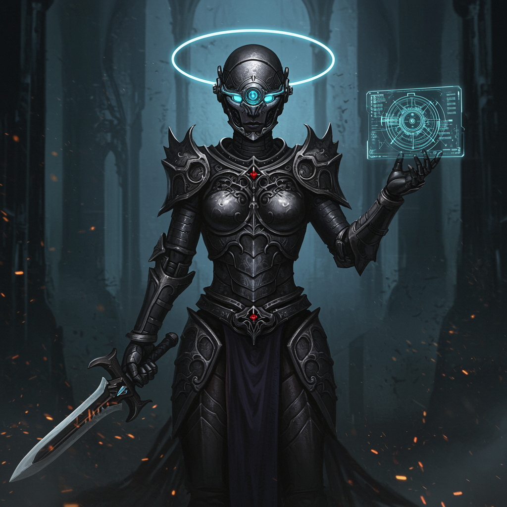 Gothic-style lone woman, a mechanical battle-hardened warrior equipped with a heads-up display, stands amidst a dark, digital fantasy high-tech world. She exudes sinister vibes with her intimidating presence. Her appearance is dark, mysterious, and haunting, characterized by dramatic and ornate details. A mechanical glowing halo hovers around her head, amplifying her ominous yet captivating aura. Her armor is intricately detailed with gothic patterns, crafting a perfect blend of elegance and menace in this detailed high-tech realm.