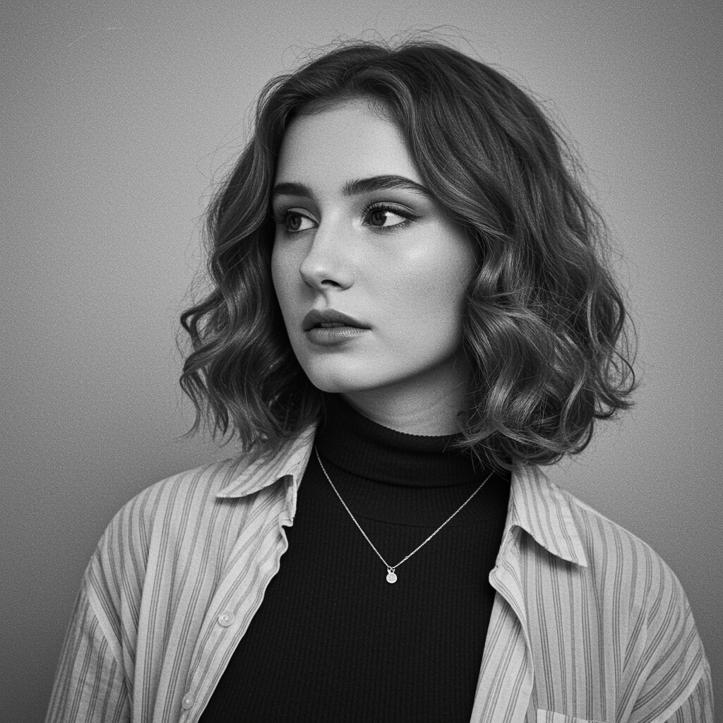 An evocative grayscale portrait of a young woman with shoulder-length wavy hair. She dons a chic ensemble featuring an unbuttoned striped blouse over a fitted, dark turtleneck, accessorized with a slender chain necklace bearing a tiny charm. Her subtle makeup highlights her expressive features, and her pensive gaze is fixed just past the viewer's line of sight. The image beautifully embodies her innate grace, rendered in timeless monochrome.