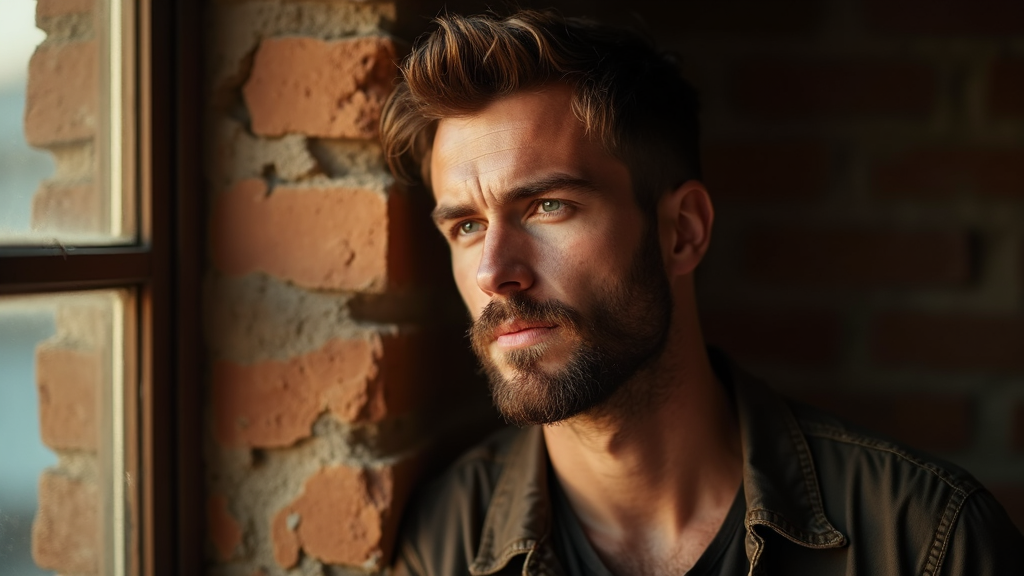 A strikingly handsome man with defined features gazes thoughtfully into the horizon. His well-maintained beard complements his sharp, piercing blue eyes that sparkle gently in the ambient glow. He leans against a rustic brick wall, his shadow highlighting the sculpted contours of his jawline. The lighting is soft and golden, evoking a tranquil and reflective atmosphere.