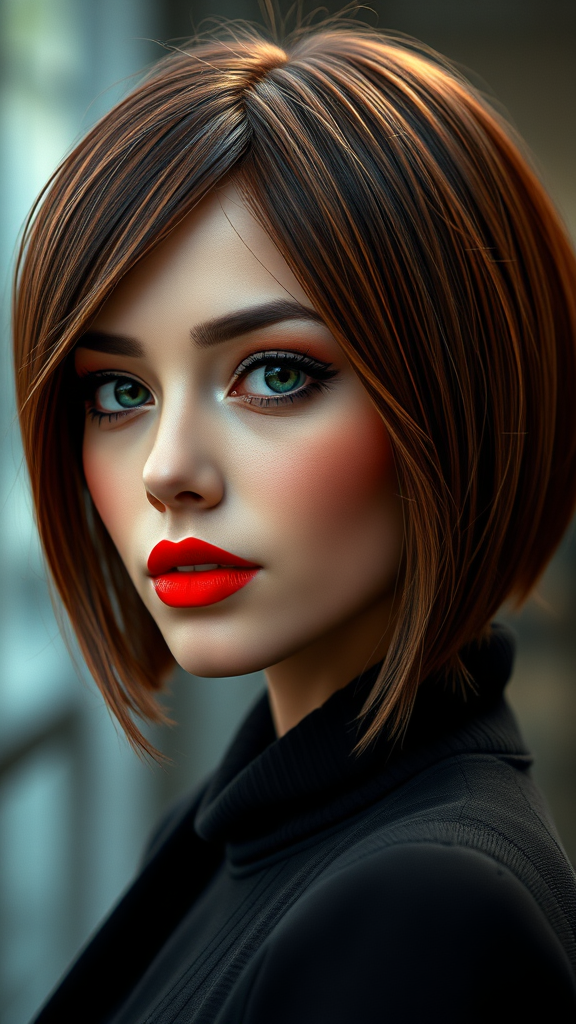 View this AI-generated image featuring her hair is styled in a sleek contemporary bob that grazes just above her shoulders its rich chestnut hue enhanced by subtle highlights that shimmer in the light adding a captivating depth to her locks the woman s makeup is impeccable featuring a delicate smoky