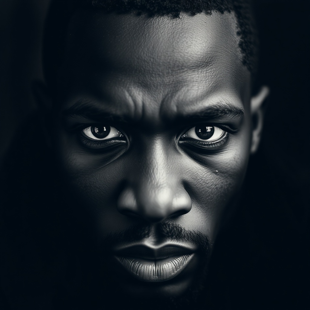 high resolution wallpaper of a black man gazing into the camera in an intense close-up, monochrome, captured with a Leica 50mm lens at f1.4, slight variances in texture and focus for artistic effect