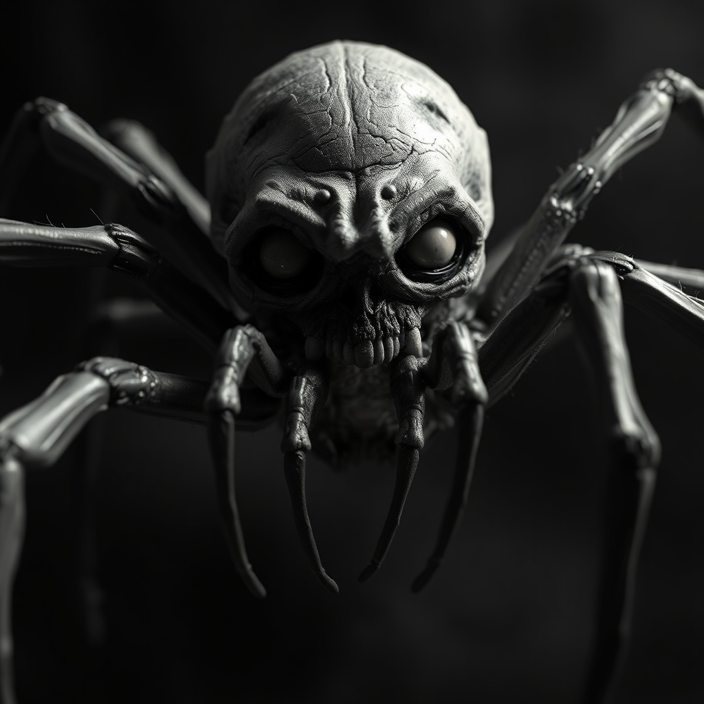 Human-spider hybrid, a grotesque mutation featuring a human head with spider legs protruding from its mouth, inspired by Gustave Doré; a monochromatic, dramatic, and eerie scene filled with a mystical aura; ultra-high definition with 8k precision, highlighting hyper-realistic textures and intricate micro details; enhanced volumetric lighting creating a surreal atmosphere; fantasy art in 3D realism with meticulous attention to detail, capturing the essence of the bizarre creature in an unsettling yet mesmerizing tableau.