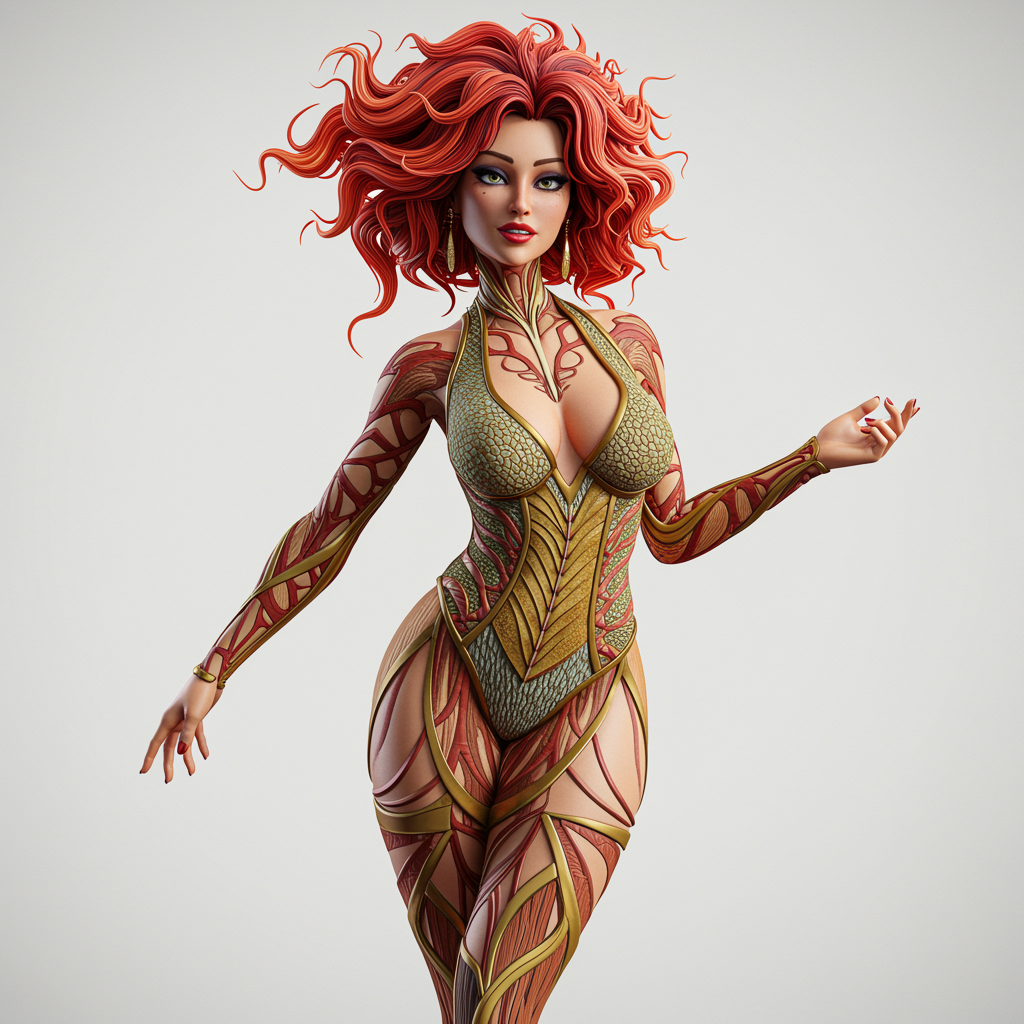 Hyper detailed full body portrait of an alluring woman in a provocatively designed dress, exuding charisma and charm, who actively flirts with a vibrant energy::5 Imaginative character design::4 Tags: creative, expressive, intricate, colorful, stylized anatomy, high-quality, digital art, 3D rendering, stylized, unique, award-winning, Adobe Photoshop, 3D Studio Max, V-Ray, playful, fantastical::2 minimalistic background, clean, slightly abstract::