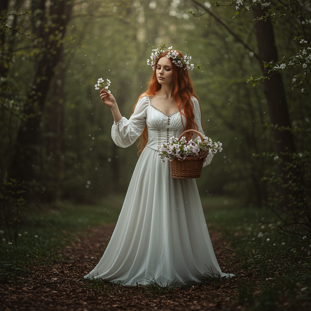 Hyper detailed enigmatic spring goddess in the ethereal forest of dreams, graceful and gentle, gathering fresh blossoms, rendered in a Bless-inspired style, lifelike and cinematic, captured in 8k resolution with a Hasselblad H4D 200MS Digital Camera, featuring dramatic lighting and impeccable composition, with a touch of mystical ambiance and a serene atmosphere.
