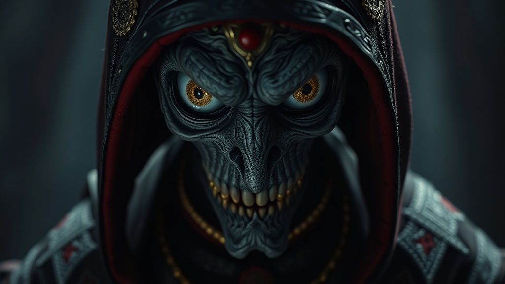Hyper-realistic character from the dark kingdom with hauntingly detailed eyes, wearing intricately designed garments with orthodox symbolism; his large eyes express intense horror. Captured with the Hasselblad H4D 200MS Digital Camera paired with a Mitakon Speedmaster 65mm f/1.4 XCD lens, illuminated by dramatic Fresnel lighting, the image conveys an eerie atmosphere. Scene set in a 1:2 aspect ratio, blending meticulous detail with a sense of foreboding, infused with subtle creative nuances.