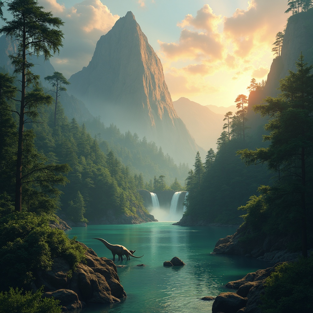 Hyper realistic landscape photoart of a prehistoric paradise, in the style of Darek Zabrocki, capturing the majesty of towering, mist-shrouded mountains and lush, verdant forests teeming with ancient life; colossal dinosaurs roam freely, their silhouettes casting long shadows in the golden glow of a setting sun, as a crystal-clear waterfall cascades down the rugged cliffs into a serene emerald lake; intricately detailed foliage and dramatic cloud formations create a cinematic, epic ambiance, all rendered in stunning 32k UHD quality, with an aspect ratio of 2:3.