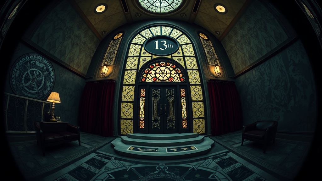 View this AI-generated image featuring hyper realistic fisheye exterior view of a tarot card titled 13th gothic elegance in style casting a watchful gaze over the scene featuring cinematic and indirect lighting reminiscent of an ad magazine shoot infused with the quirky essence of tim burton harmoni