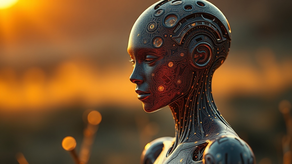 Hyper-realistic medium shot portrait featuring a hyperdimensional artificial humanoid being with exquisitely detailed and regularly textured bioluminescent skin. The figure is intricately ornate, exhibiting a hyper-futuristic design. Inspired by artists on ArtStation, the scene is set in the golden hour, casting a warm glow with a subtle bokeh effect in the background. The digital artwork captures influences from Tooth Wu, WLOP, Android Jones, Beetle, and Greg Rutkowski, blending their unique styles into a seamless composition. The humanoid's presence is ethereal, with a mesmerizing blend of elegance and otherworldly allure, characterized by its luminous skin and the intricate patterns flowing like an organic circuit board. The setting blends elements of nature and advanced technology, reflecting a harmony between the two.