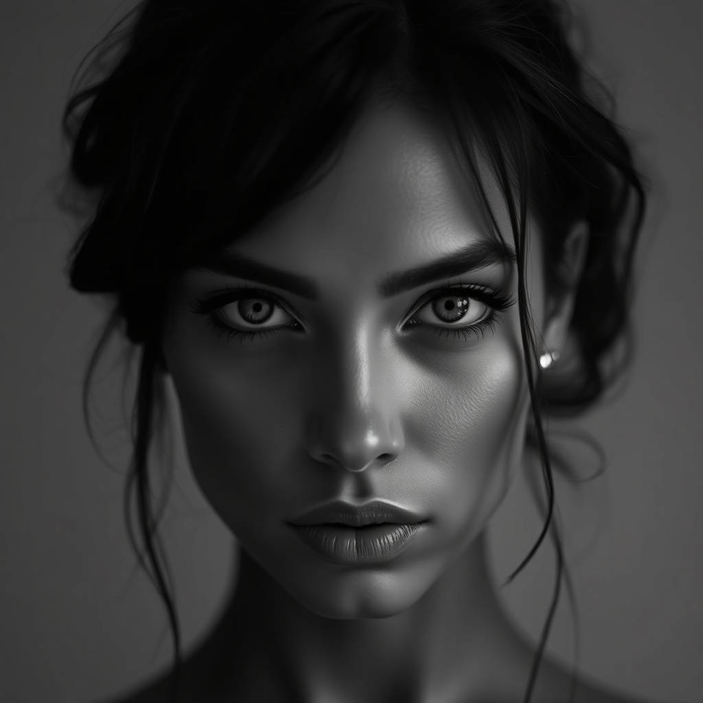 View this AI-generated image featuring hyper realistic portrait captivating woman with striking features monochromatic tones photographed with a sony a7iii intense contrast and depth whispers of chaos in the composition elongated aspect ratio capturing elongated elegance personal touch aligning uniq