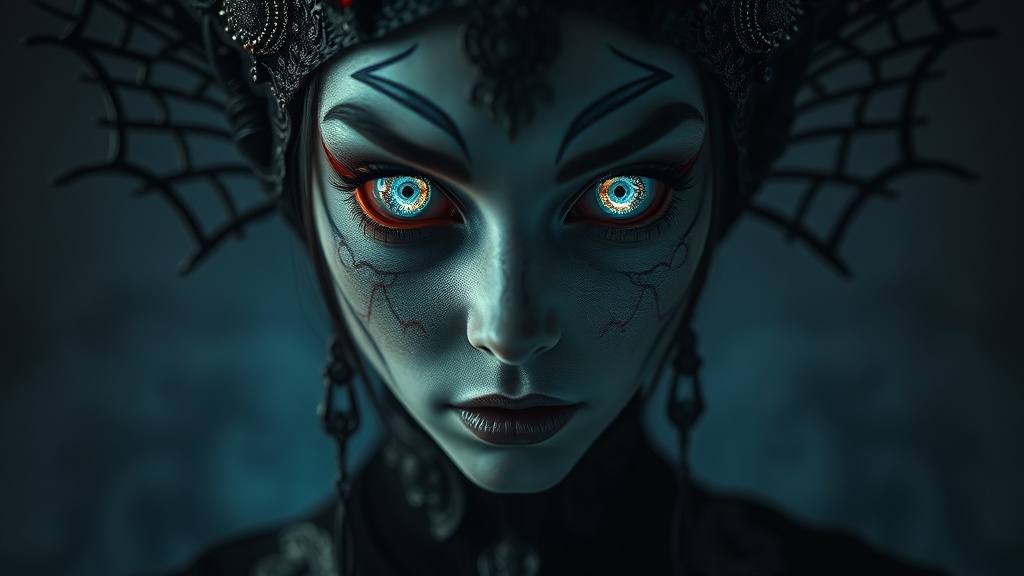 View this AI-generated image featuring hyper realistic portrait from the shadowy realm featuring a figure with hauntingly hyper detailed attire that tells a symbolic tale her expansive eyes like prismatic portals reflecting sheer terror captured with the finesse of a hasselblad h4d 200ms digital cam