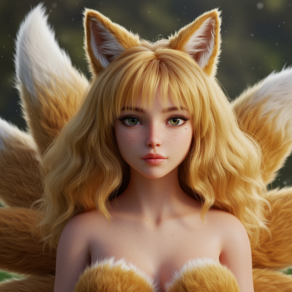 View this AI-generated image featuring hyper realistic portrayal of a fluffy nine tailed fox girl featuring a blend of photography and digital painting utilizing 8k resolution with soft natural lighting this creation merges cgi elements with a 3d doll like appearance balancing between cartoon anime