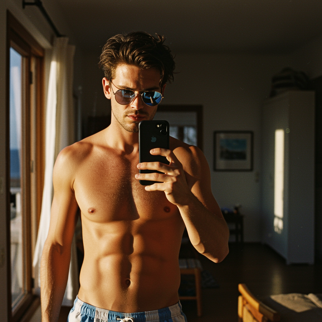 Hyper-realistic snapshot of a striking man in stylish beachwear, reflective sunglasses perched on his nose, captured in an iPhone 14 mirror reflection. His short, dark hair is slightly tousled, and he's standing in a sunlit, inviting room that exudes warmth. The scene is imbued with the nostalgic feel of Kodak Portra 800 film, with a subtle film grain adding texture. The shallow depth of field at f1.8 highlights his features, while the golden hour light bathes everything in a soft, flattering glow.