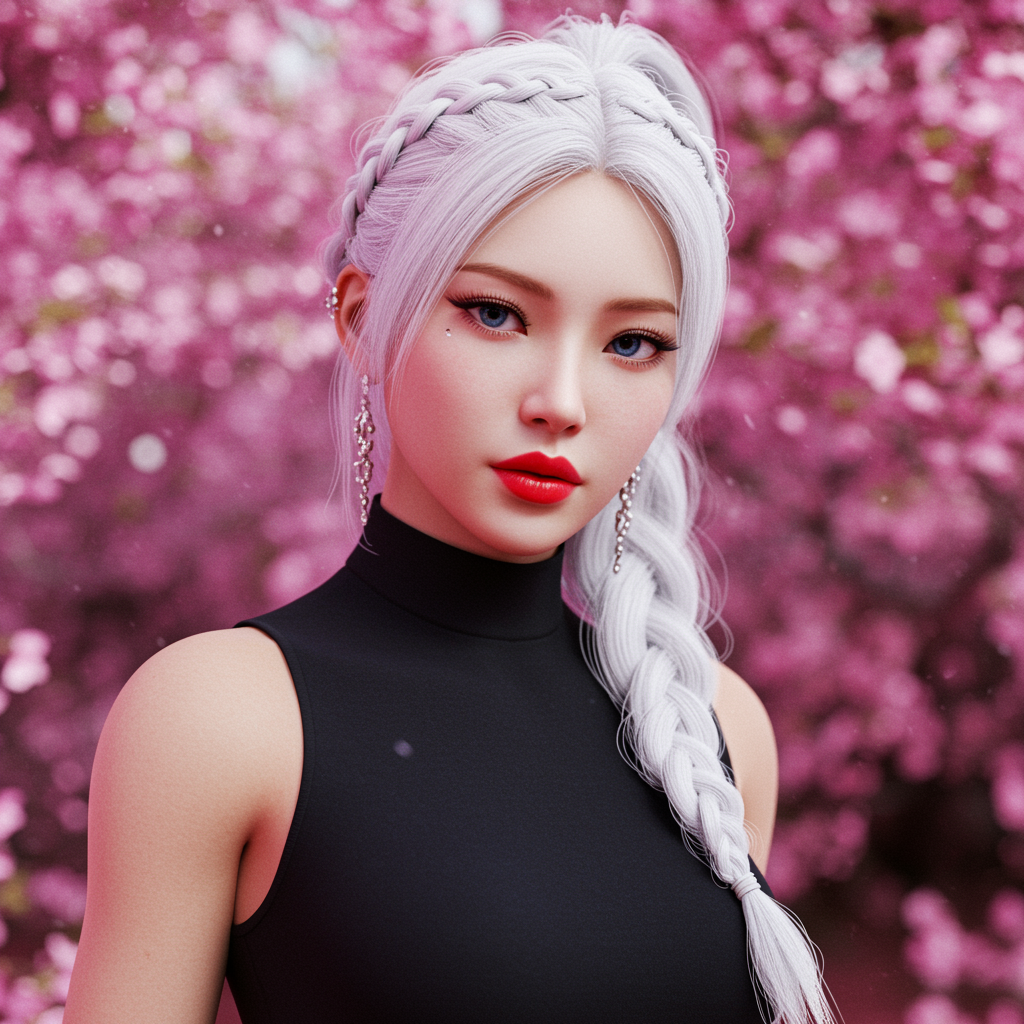 Hyperrealistic portrait of a captivating Korean kpop idol with an elegant white braided ponytail and vibrant red lips, adorned in a sleek all-black sleeveless bodysuit. She stands amidst a mesmerizing cherry blossom backdrop. Captured with a Canon R5 and a 200mm lens in sharp focus, the photograph is shot in RAW format, showcasing a photorealistic and intricately detailed face in stunning 8k HD quality. The high detail RAW color photo features cinematic lighting and is enhanced with ultra-high resolution, emphasizing the realistic skin textures. The dramatic lighting and rich colors create a masterpiece trending on Artstation, with a hyper-realistic, professional look inspired by Unreal Engine rendering. The image is devoid of any distortions or low-quality artifacts, focusing solely on the beauty and intricate details, offering a seamless blend of realism and artistic vision.