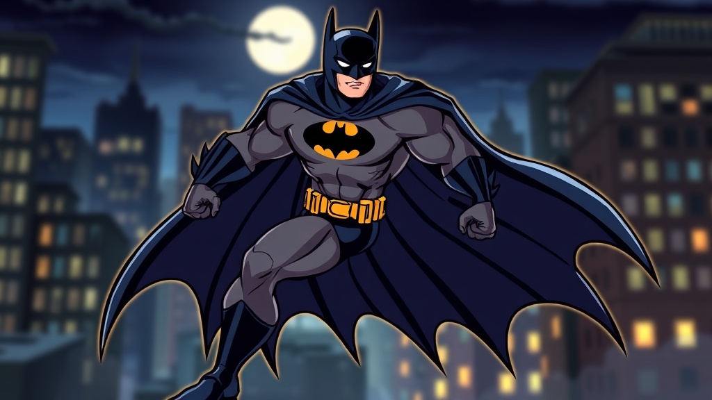 A vibrant illustration of a full-body Batman character in a dynamic cartoon comic style, exuding energy and motion with a sleek and muscular build. The costume features a classic dark-gray suit with a bold, streamlined bat symbol on the chest, accented by a deep navy-blue cape flowing dramatically in the wind. Batman's stance is powerful and poised, one foot forward and fists clenched, ready for action. The background is a blurred cityscape at night, with hints of moonlight casting a subtle glow on the figure, lending an air of mystery and intensity to the scene. The overall composition is vivid and sharp, capturing the essence of the character in an engaging and lively manner.