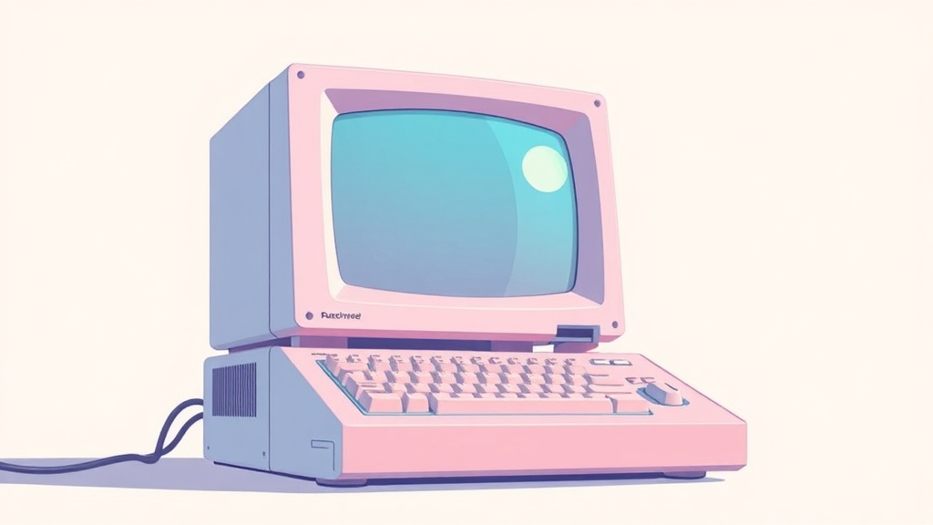 A nostalgic illustration of a classic computer, infused with a vaporwave aesthetic, inspired by the style of Jim Steranko, featuring soft pink and blue hues against a clean white backdrop, evoking a sense of retro-futurism and artistic flair with subtle creative twists.
