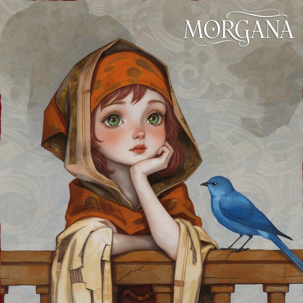 A captivating illustration depicts a young girl with ethereal features and large, expressive green eyes, wearing an intricately patterned, orange and gold headscarf and a cloak reminiscent of aged, cracked frescoes. She thoughtfully rests her chin on her hand, her gaze fixed on a lively, azure blue bird perched delicately on a rustic wooden rail. The background features a subdued palette of artistic, misty gray-blue hues, with faint abstract patterns evoking an ancient mural's atmosphere. The scene harmoniously blends elements of whimsy, nostalgia, and fantasy, characterized by intricate details and a gentle, painterly texture. In the upper right corner, the name 'MORGANA' elegantly appears, hinting at the origin or creator of the piece.