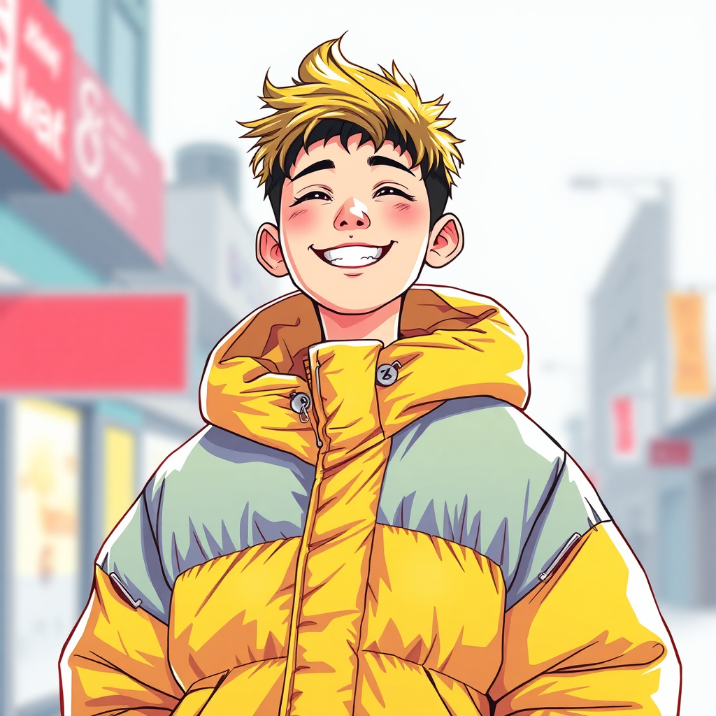 View this AI-generated image featuring a vibrant illustration of a cheerful young man clad in a uniquely styled oversized puffer jacket that resembles a poncho inspired by the edgy aesthetic of off white and the nostalgic vibes of tumblr the artwork channels the distinctive style of yanjun cheng fea