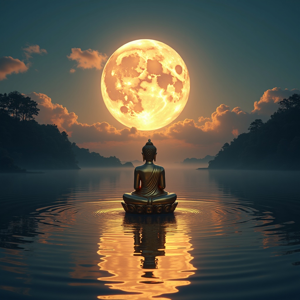 View this AI-generated image featuring a stunning image of a golden buddha sitting serenely on water bathed in the glow of a luminous full moon in the sky artfully styled as a mesmerizing optical illusion with intricate reflections and ethereal lighting vibrant colors and detailed textures capturing