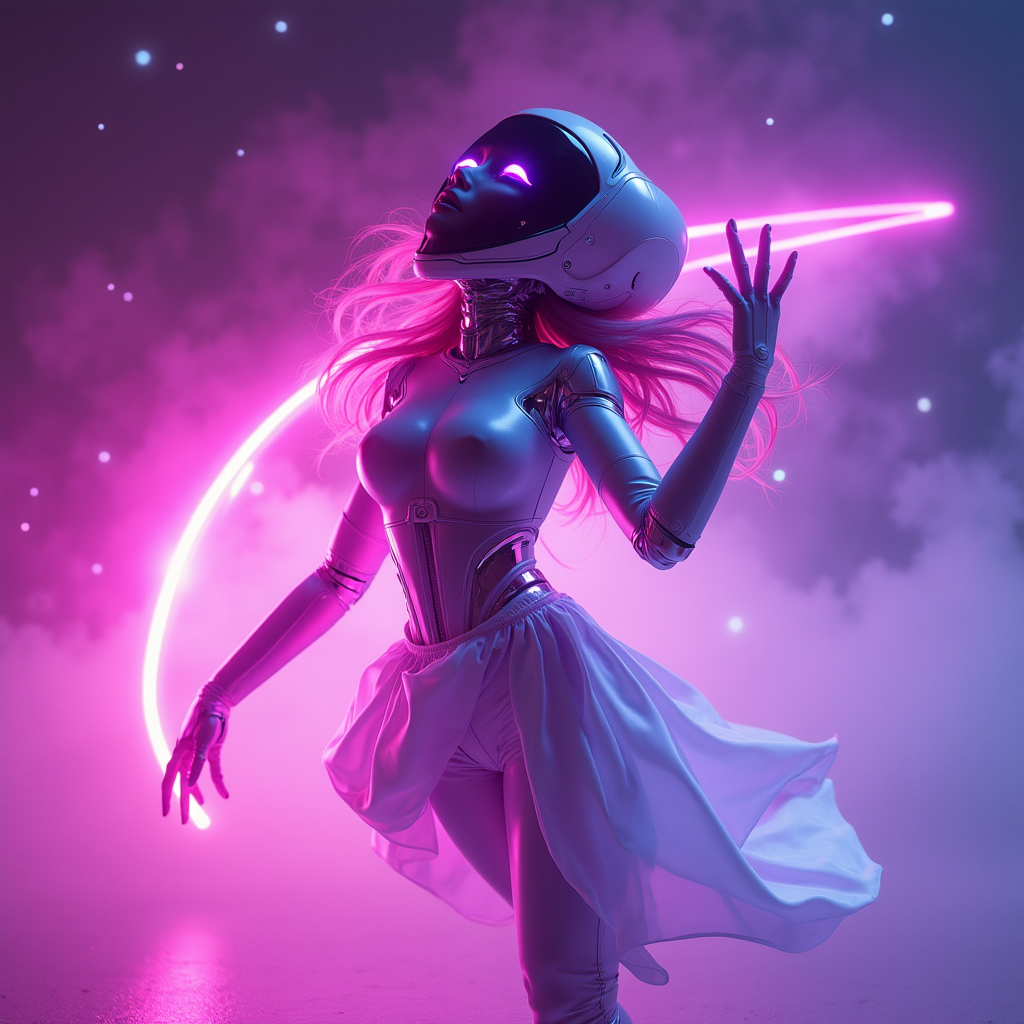 A high-resolution image captures the essence of a dynamic AI character in a futuristic setting, her face remarkably human-like despite her artificial nature. She dons a sleek metal suit, complete with a helmet, blending seamlessly with the advanced aesthetics of her surroundings. Energetically poised, her flowing garments suggest motion, caught mid-leap as if reaching for something above. The vibrant color palette features striking pinks and reflective silvers, reminiscent of vivid nightcore aesthetics. Dramatic backlighting creates a neon glow, contrasting against the darker cosmic backdrop, giving her an effervescent brightness. The character is rendered in sharp focus, her purple eyes gleaming with intensity, while the background remains suitably blurred to enhance her prominence. Realistic textures adorn her clothing and hair, with a visible light source in her hands, casting an otherworldly luminescence. The composition, reminiscent of a candid snapshot from a GoPro HERO10 Black using Cinestill 800T film, captures a spontaneous moment of action within a surreal cyberpunk universe, embodying a cinematic scene that feels alive and vibrant. Her gesture and gaze directed upwards hint at an unseen narrative within this imaginative sci-fi setting.