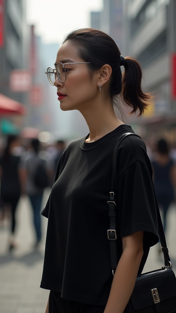 A photorealistic image captures a side view, upper-body portrait of an elegant and wise Korean woman model standing gracefully on a bustling Seoul street. Amidst the vibrant crowd, her serene gaze reflects her seasoned wisdom and life experience. She is dressed impeccably in a monochrome black, loose-fitting T-shirt paired with a sleek black shoulder bag. Her hair is neatly pulled back into a tidy ponytail, complemented by stylish silver-framed glasses. Her bold and confident pose embodies aged grace and emits an urban fashion aura. The interplay of realistic sunlight and shadows accentuates the urbanism vibe, with a focus on high-definition realism that highlights every intricate detail. The scene offers a subtle yet creative twist on classic city fashion photography while adhering to contemporary style aesthetics.
