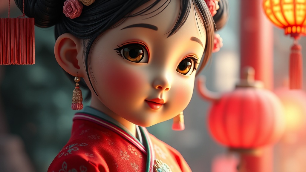 A captivating image of a young Chinese girl, evoking the enchanting aesthetics of Unreal Engine 5, with influences from Disney animation. The girl resembles an adorable toy sculpture, with an intricate blend of Charles Willson Peale's classic portrait style and the whimsical charm of Jeremiah Ketner and Mark Ryden. The setting exudes an aurorapunk ambiance, with ethereal lighting and dreamlike textures, highlighting her vibrant traditional attire. The portrayal balances realism and enchanting fantasy, displaying a delicate harmony of colors and emotions.