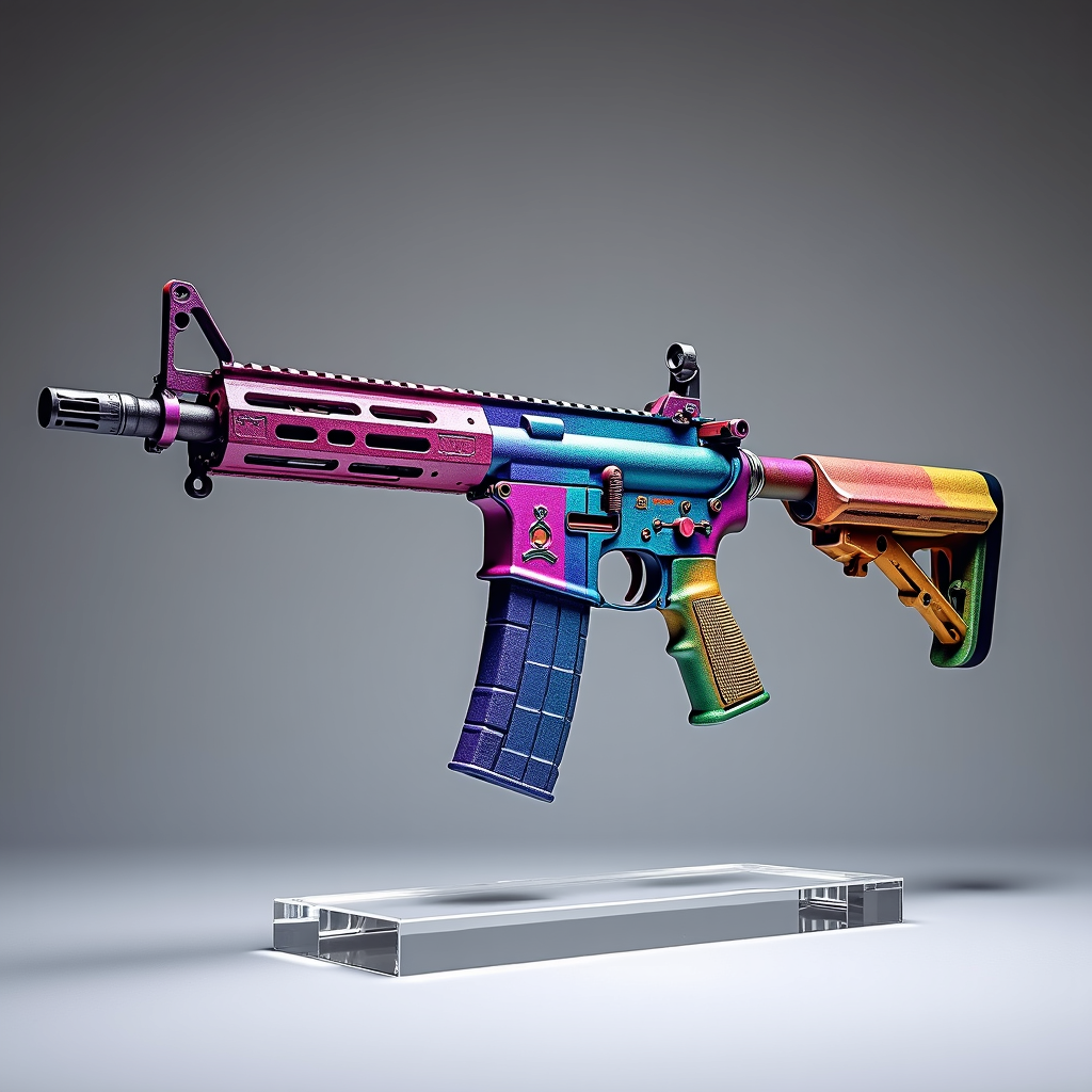 A mesmerizing image of an AR15 rifle transformed into an art piece, featuring vibrant psychedelic colors across its structure, showcased on a sleek modern acrylic stand. The presentation invites contemplation by merging the themes of conflict and tranquility, with the weapon and magazine covered in vivid, unconventional hues. Captured in a professional photography studio with a neutral backdrop, the composition explores a fascinating contrast between the stark reality of the object and its colorful makeover. Utilizes professional studio lighting, with diffused light and subtle bokeh. The camera is positioned at a 45-degree angle for a close-up shot, using a Sony A7S III with a 35mm lens, ISO 100, low shutter speed, and aperture set to f4. Delivers a premium quality stock image in digital photography, characterized by sharp clarity and high resolution, and excluding any text or signatures.