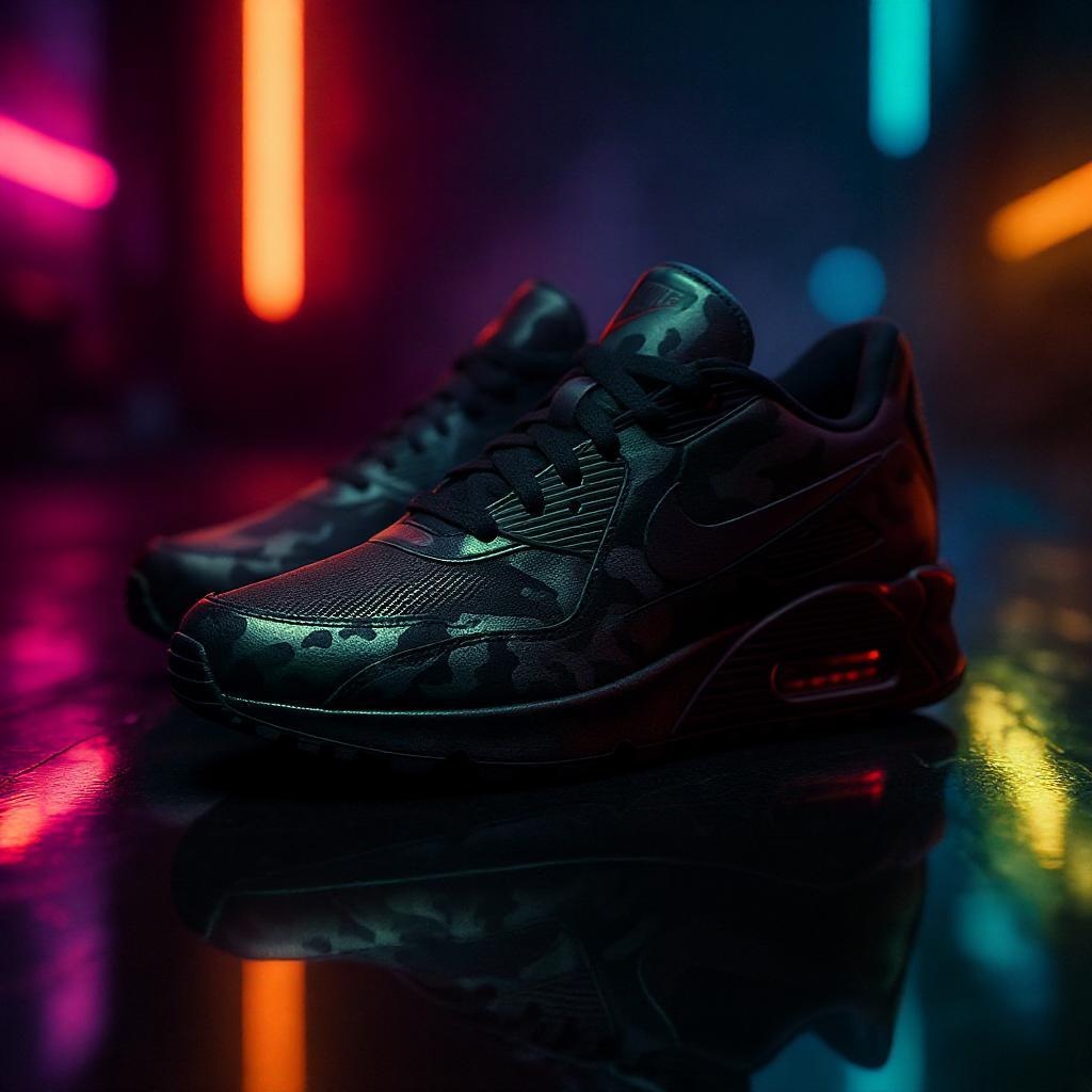 A captivating image showcasing a pair of Nike shoes adorned with a sleek black camouflage pattern, highlighted by the vibrant glow of neon lights. The shoes are set against a reflective surface, enhancing their striking design and creating a mesmerizing mirror effect. This scene captures a sense of dynamic energy and modern productivity, infused with a sense of urban style and innovation.