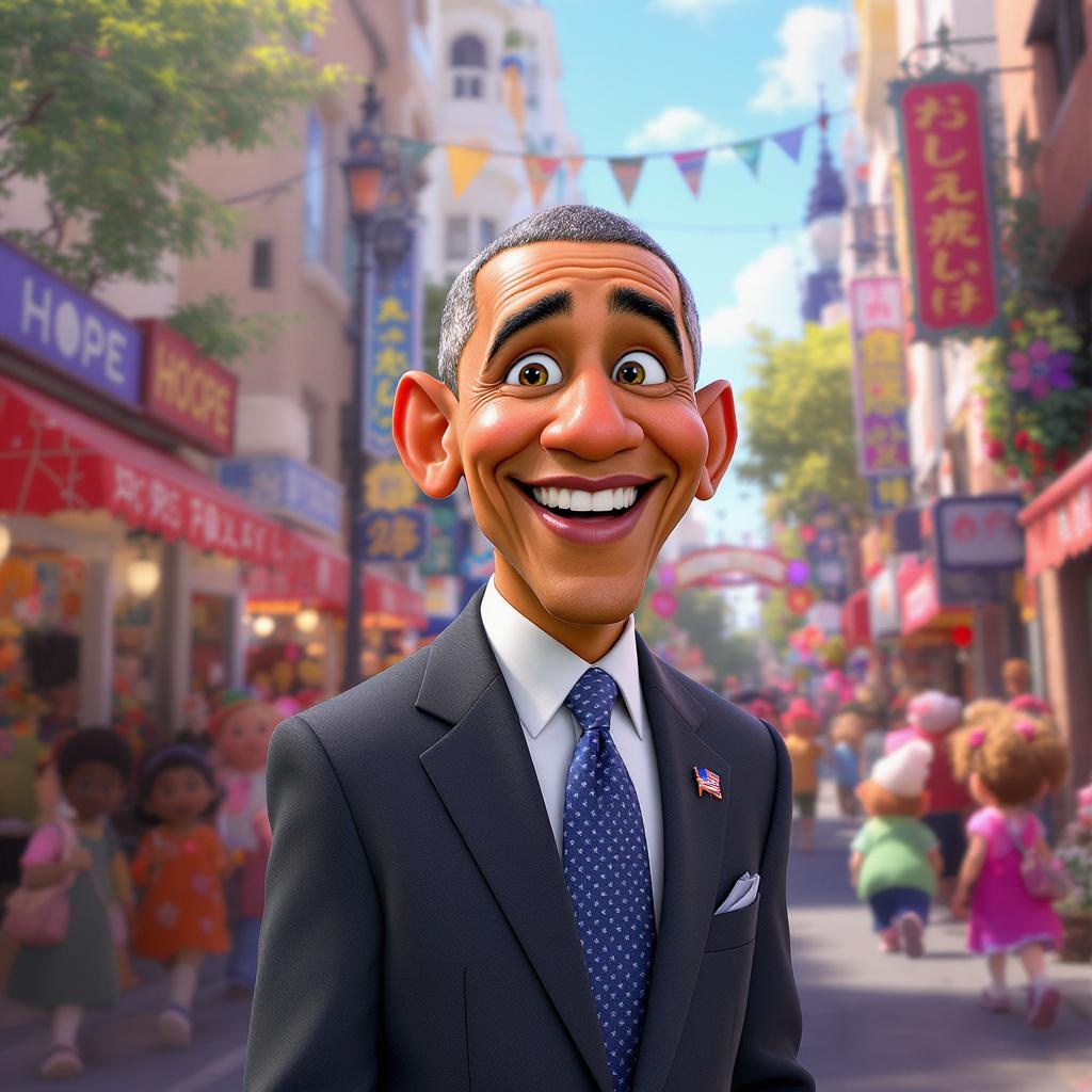 Imagine a charismatic, animated character with a warm smile and commanding presence, much like President Obama, reimagined in a vibrant Pixar universe. His eyes twinkle with wisdom and humor, while his sleek, stylized suit and tie reflect his iconic leadership role. With an air of approachability, he engages in captivating conversations with other colorful characters in a bustling, dynamic city, embodying the spirit of hope and unity.