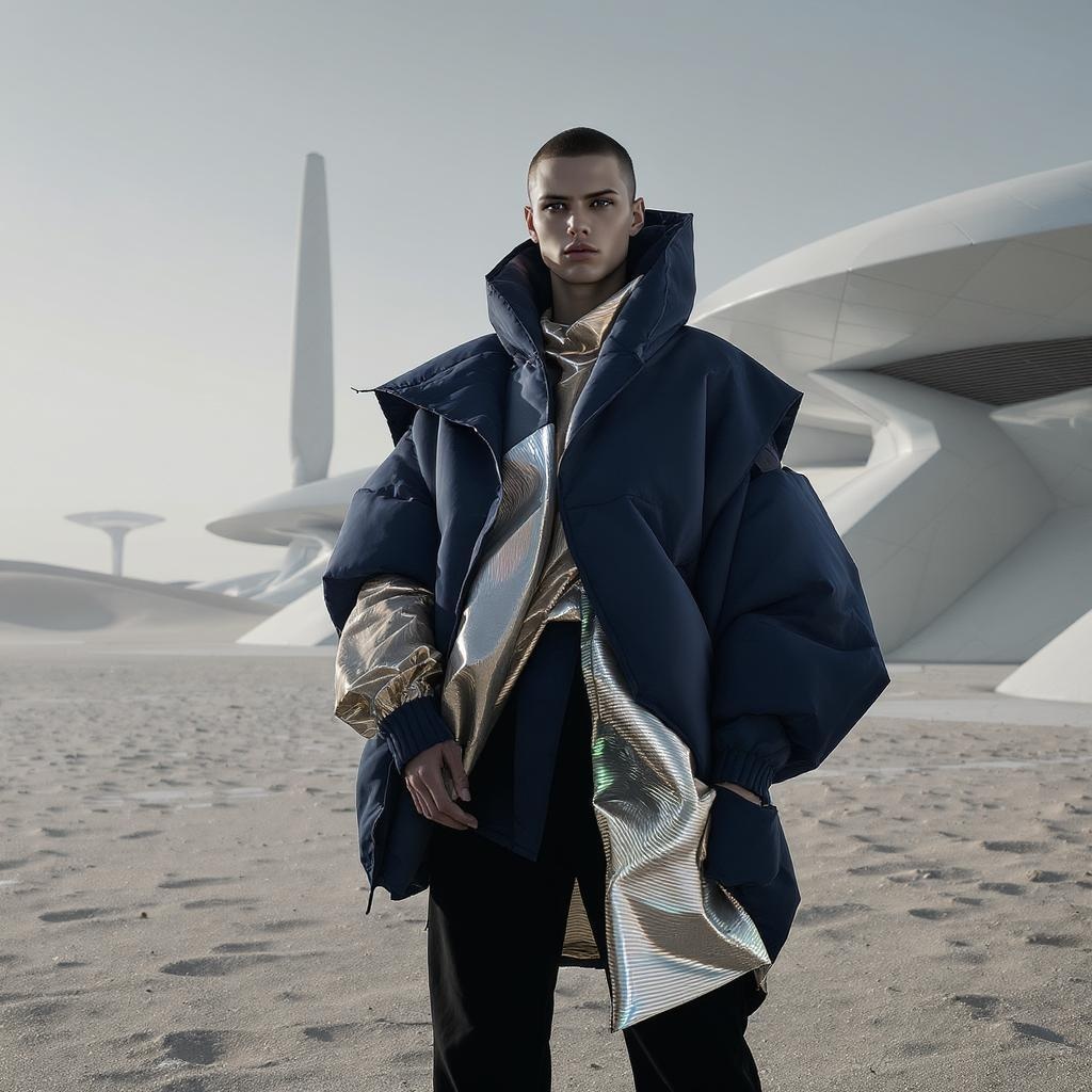 "Imagine a fashion line that fuses the sleek, minimalistic aesthetics of the future with the rugged, adaptable essence of nomadic life, resulting in garments that embody both functionality and cutting-edge style. These creations boast dynamic silhouettes that transform effortlessly to suit various environments, reflecting the fluidity of a wandering lifestyle. Innovative materials, such as temperature-regulating fabrics and self-cleaning textiles, are seamlessly integrated into the designs, offering practicality for the modern wanderer. The collection includes modular pieces that can be layered or detached, embodying versatility, while bold geometric shapes and iridescent hues evoke a sense of endless exploration. This fashion line not only embraces the nomadic spirit but thrives in a world where technology and tradition harmoniously coexist."