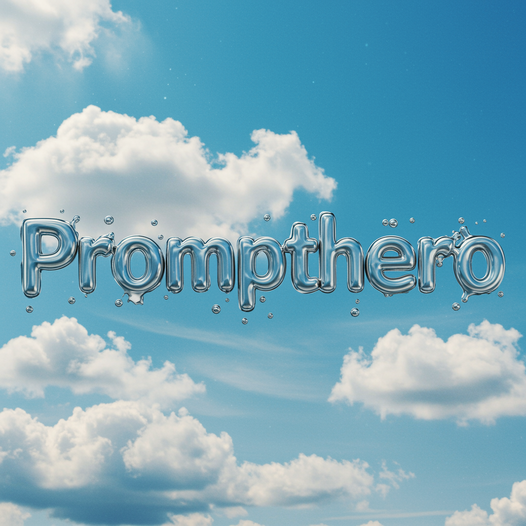 Imagine a glossy liquid metal ink forming the word "Prompthero," each letter artistically splashed with metallic sheen, as if crafted from mercury. The letters, glistening and fluid, are suspended gracefully amidst a backdrop of a surreal, dreamy blue sky, with soft, fluffy clouds lazily drifting by. The sky, painted in varying shades of blue and white, enhances the metallic allure of the word, casting reflective highlights that dance across each letter as though touched by sunlight, imbuing the scene with a sense of wonder and creativity.