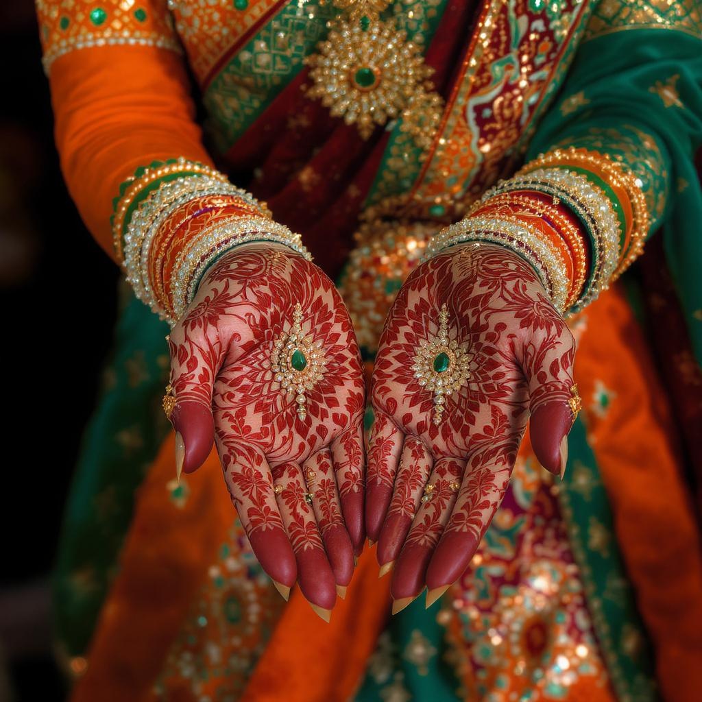 A stunning Indian bride wearing intricate traditional attire, displaying her hands adorned with elaborate henna designs, captured in photorealistic detail and ultra-high definition. The scene is meticulously detailed and hyperrealistic, utilizing a wide-angle lens for an expansive view, and shot on 70mm film for depth and richness. The composition features Indian-inspired motifs with bold color contrasts: deep amber and lush emerald, rich turquoise and warm brown, vibrant orange with emerald accents, and a blend of dark crimson with deep turquoise. The lighting emphasizes high-definition textures and high-contrast shading, enhancing the ethereal beauty of the bride and her intricate adornments.