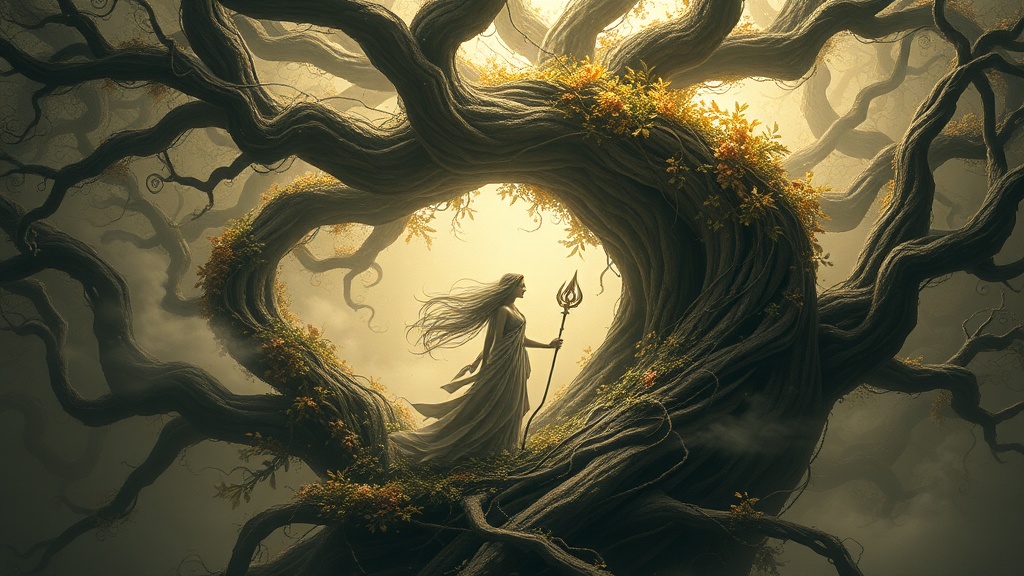 Inspired by the original concept, envision a highly intricate, hyper-maximalist scene featuring an otherworldly floral and forest deity. The figure possesses long, flowing hair and minimalistic attire, reminiscent of a Magic the Gathering character, surrounded by swirling clouds of leaves and wind. This deity stands within the spiraling vines of a colossal ancient tree, exuding an aura of ominous intricacy yet breathtaking beauty. Captured with ArtStation and Unreal Engine quality, the scene is characterized by intense lighting and shadows. The composition includes echoes of orthodox symbolism intertwined with ambient magic realism, enhanced by ambient occlusion and volumetric lighting to evoke deep emotion. Rendered in stunning 8k resolution, the piece embodies a tribal dark fantasy aesthetic in an aspect ratio of 3:2, seamlessly blending the mystical and the familiar into a captivating whole.